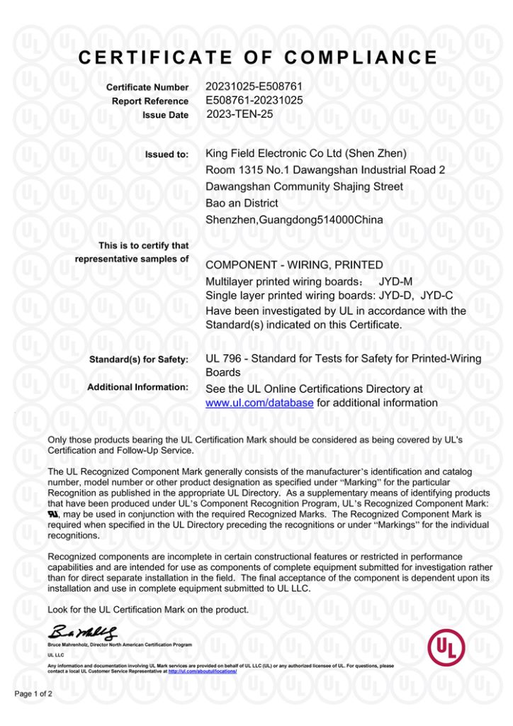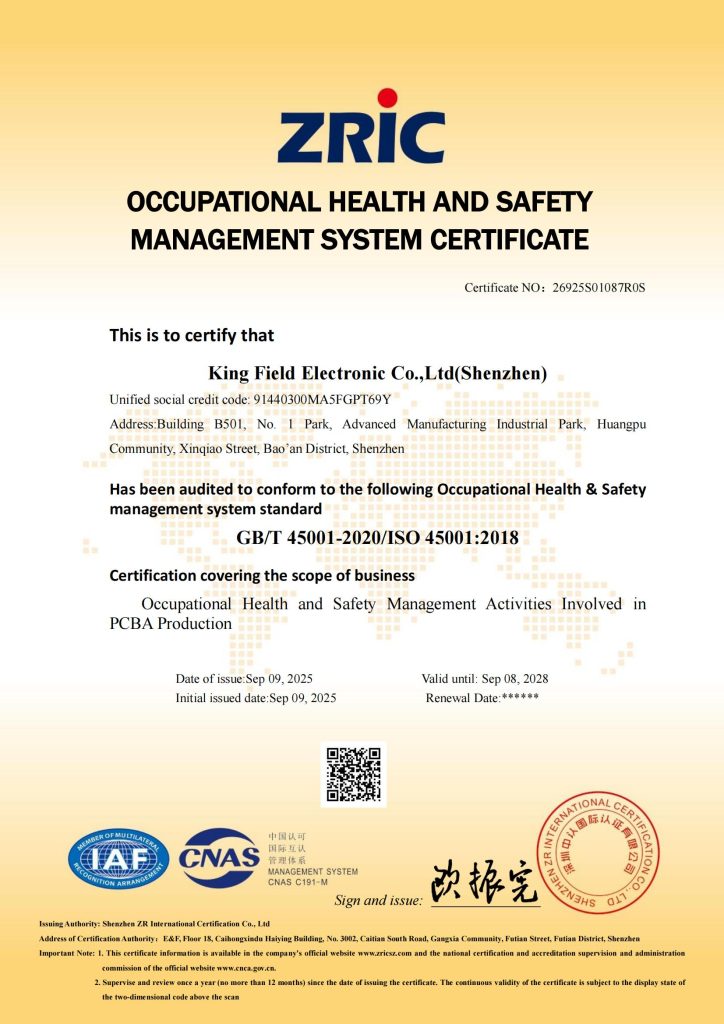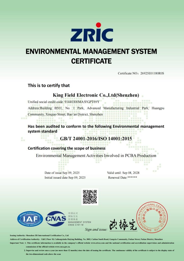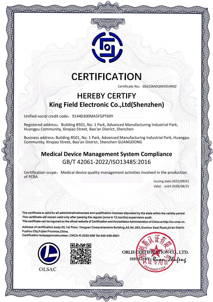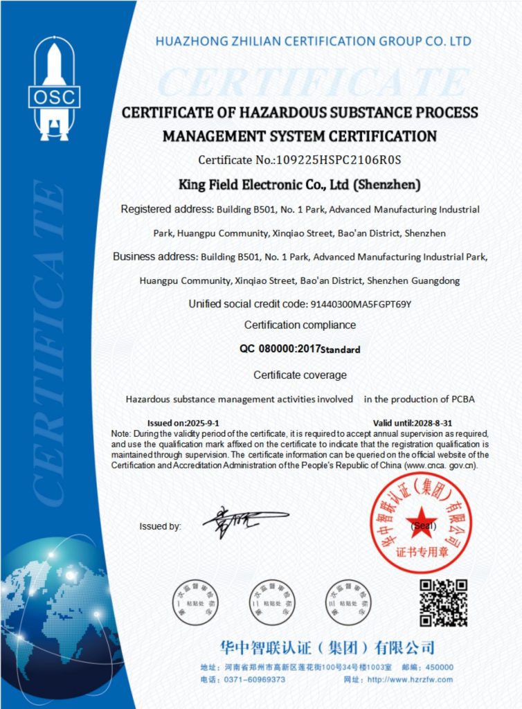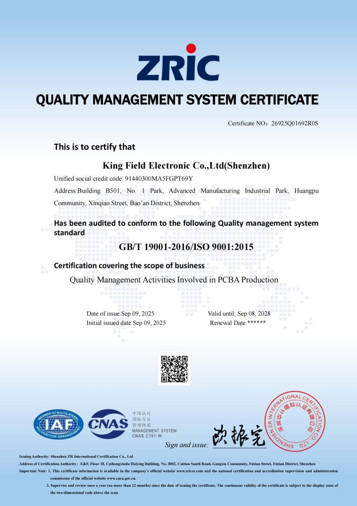 KING FIELD Founded in 2013, we are a leading one-stop service provider for electronic product development and design, PCB manufacturing, and PCB assembly. With years of industry experience, we have obtained international certifications, including ISO 9001, ISO 14001, ISO/TS 16949, and UL , and have been recognized as a national high-tech enterprise and a specialized and innovative enterprise.
